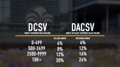 Your Selling Bonus (SB) of 4-20% and your Referral Bonus (RB) of 4-24% is determined by the amount of DCSV you have. The higher your DCSV the higher your SB & RB are!